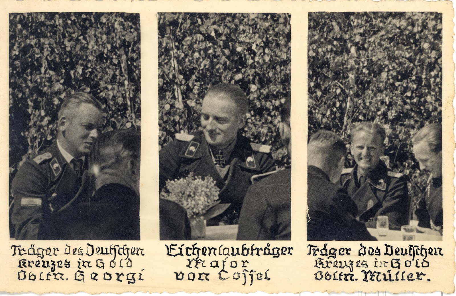 Dari kiri ke kanan: Oberleutnant Heinrich "Heinz" Burkhard (Adjutant I.Abteilung / Panzer-Regiment 35), Major Hans-Detloff von Cossel (Kommandeur I.Abteilung / Panzer-Regiment 35) dan Hauptmann der Reserve Hans-Georg Müller (Chef 1.Kompanie / I.Abteilung / Panzer-Regiment 35). Yang terakhir - bersama dengan seorang perwira lain - memakai kacamata hitam untuk mengatasi terik matahari yang menyengat di musim panas Front Timur. Tampaknya Cossel sedang berpidato dengan diiringi para perwiranya