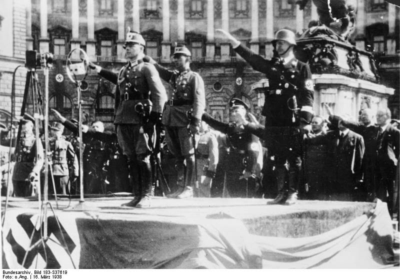 Generaloberst Fedor von Bock (Oberbefehlshaber Heeresgruppen-Kommando 3) memberi hormat militer kepada pasukan berkuda Wehrmacht dalam parade militer yang diselenggarakan di Ringstraße Wina tanggal 14 Maret 1938, dua hari sebelum Anschluss (Penyatuan) Austria dengan Jerman. Memakai kacamata dan Stahlhelm Sondermodell 1918 di sebelah kiri adalah General der Kavallerie Maximilian Reichsfreiherr von Weichs (Kommandierender General XIII. Armeekorps), sementara perwira Luftwaffe di sebelah kanannya adalah Generalmajor Ludwig Wolff (Höherer Flieger-Kommandeur 5 und Höherer Kommandeur der Luftwaffeneinheiten in Österreich), disusul oleh Oberst Maximilian de Angelis (Staatssekretär im Bundesministerium für Landesverteidigung Wien) yang memakai seragam militer Austria. Berdiri di belakang Von Bock dengan memakai pakaian sipil adalah Reichsstatthalter Arthur Seyß-Inquart (Leiter der österreichischen Landesregierung), disusul oleh SS-Brigadeführer Ernst Kaltenbrunner ("Staatssekretär für das Sicherheitswesen im Lande Österreich" und Führer des SS-Oberabschnitts Donau) yang memakai schirmmütze hitam SS di belakang Seyß-Inquart. Satu lagi: yang memakai pakaian sipil di belakang Von Weichs adalah Ludwig Ritter von Eimannsberger, pensiunan General der Artillerie yang nantinya dipanggil kembali untuk bertugas aktif bulan Agustus 1938